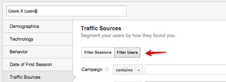 Wykorzystując standardową segmentację Google Analytics, mamy do wyboru segmentowanie na poziomie sesji i na poziomie użytkownika, gdzie: