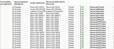 W tej sytuacji z naszej bazy danych produktów pobieramy listę produktów, których nie możemy już sprzedawać. Całą bazę produktów wraz z numerami id tych produktów wklejamy do tego pliku excel, na którym pracowaliśmy przy początkowym tworzeniu kampanii AdWords (wklejamy nowe dane obok starych).