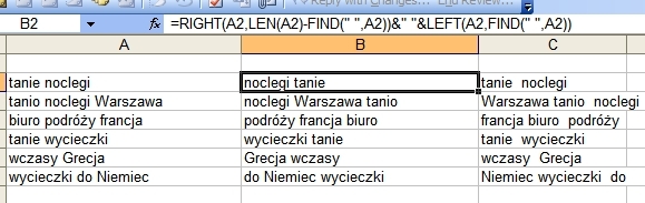 Prostym sposobem na powiększenie ilości słów kluczowych jest odwrócenie porządku wyrazów w wyrażeniu (np. przekształcenie słowa kluczowego nocleg tanio na tanio nocleg). Można to zrobić za pomocą prostej formuły w Excel.