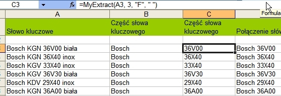 Za pomocą tego makra można pobrać dowolny wyraz ciągu znakowego. Robi się to wywołując w Excelu nowo utworzoną funkcję My Extract, której składnia w samym excelu jest następująca: