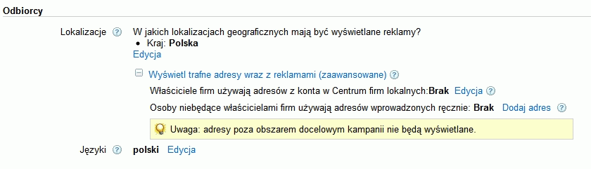 - w drugiej sekcji tej zakładki, zatytułowanej Odbiorcy kliknąć przycisk Wyświetl trafne adresy wraz z reklamami (zaawansowane)